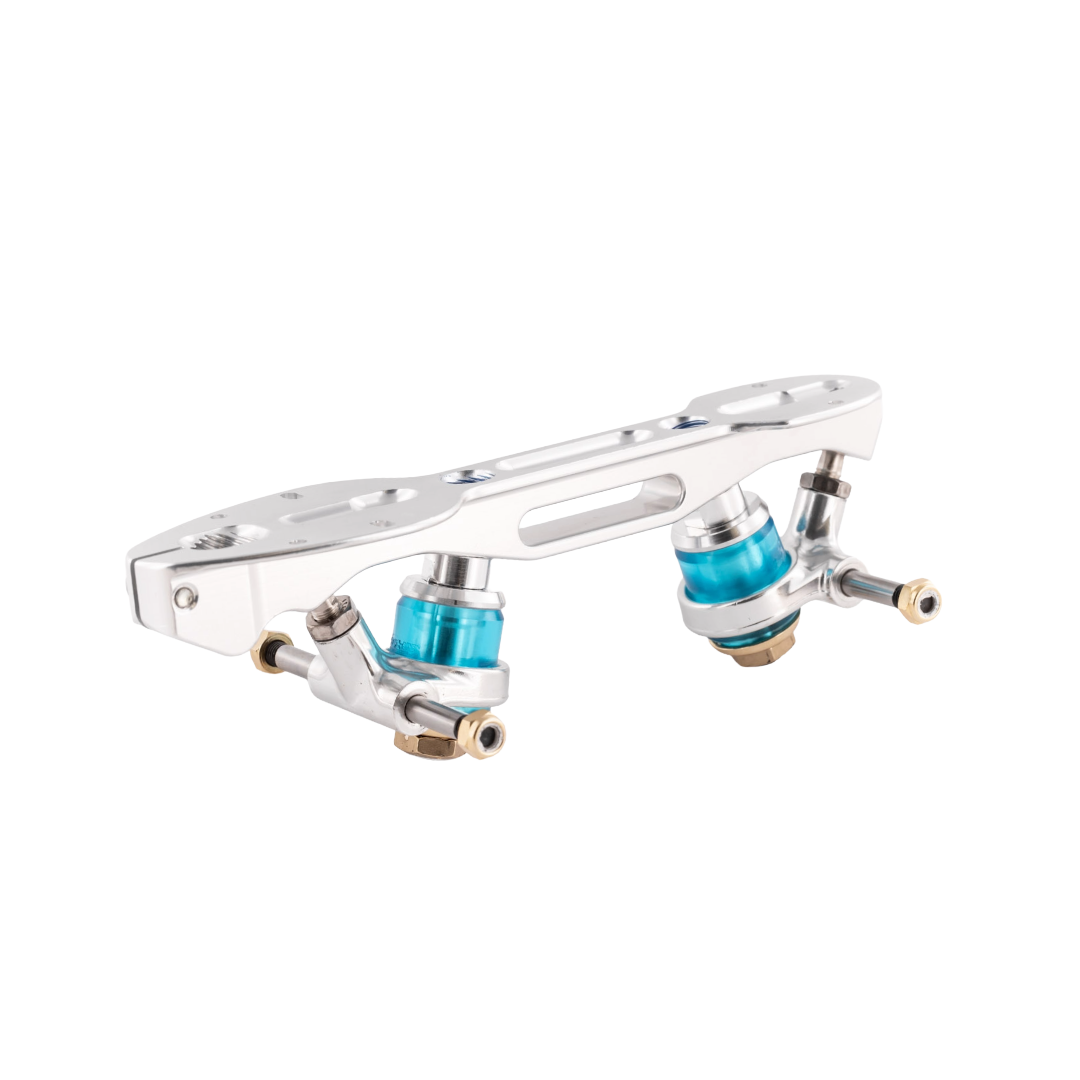Patins professionals d’alumini mecanitzat amb diferenciació esquerra-dreta. Suspensions d’elastòmer disponibles en cinc dureses. Sistema d’ajust “click action” amb cargol de bloqueig. Espàrrecs de 13 mm amb inclinació clàssica a 16º. Carros d’alumini amb eixos d’acer i pivot ajustable. Inclou frens Roll-line Ambar (model professional) i joc de claus.